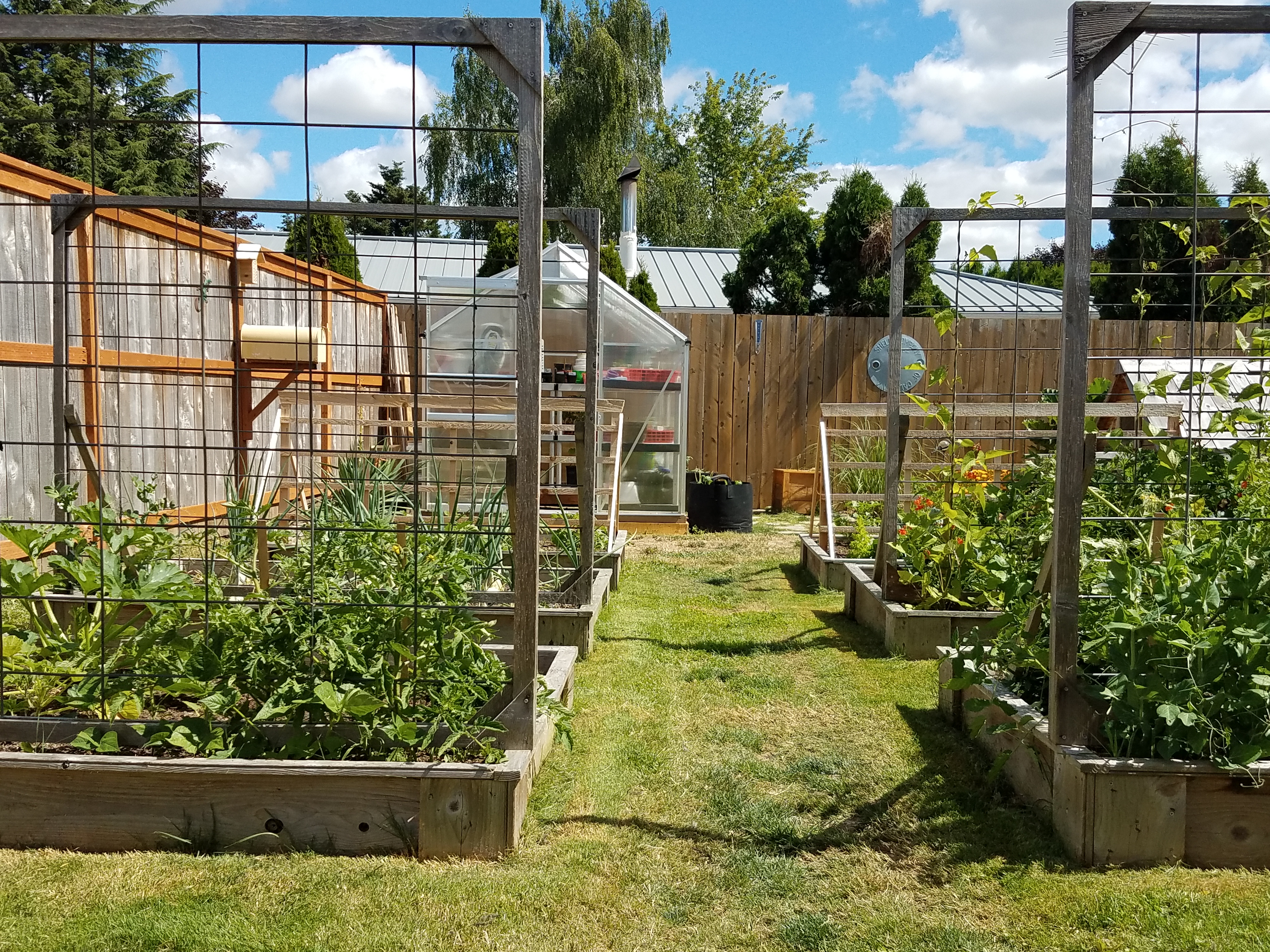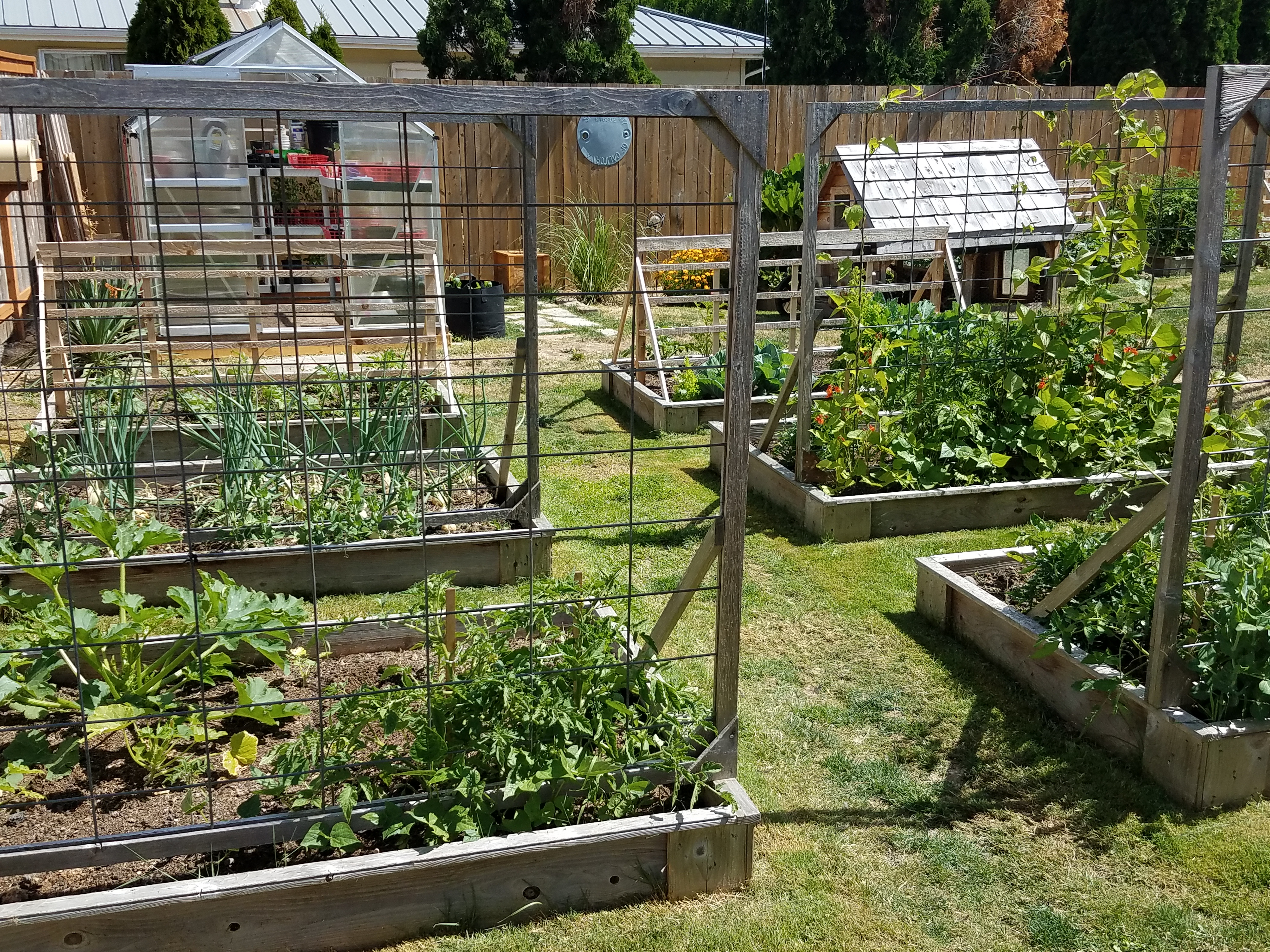 In our garden, we have a total of 8 raised beds that are 4 feet x 6 feet in dimension. We also have 3 3-tiered beds with the bottom tier being 4 feet x 4 feet, the middle tier is 2 feet x 2 feet and the top tier is 1 foot x 1 foot. We also have several other planters and 20 gallon grow bags that we use as we have outgrown our raised beds. All of our beds are made from cedar wood which is untreated and both ages and weathers well. Also, in these raised beds, we have trellises for plants that vine and are able to grow up these trellises thus reducing their footprint in the garden bed.